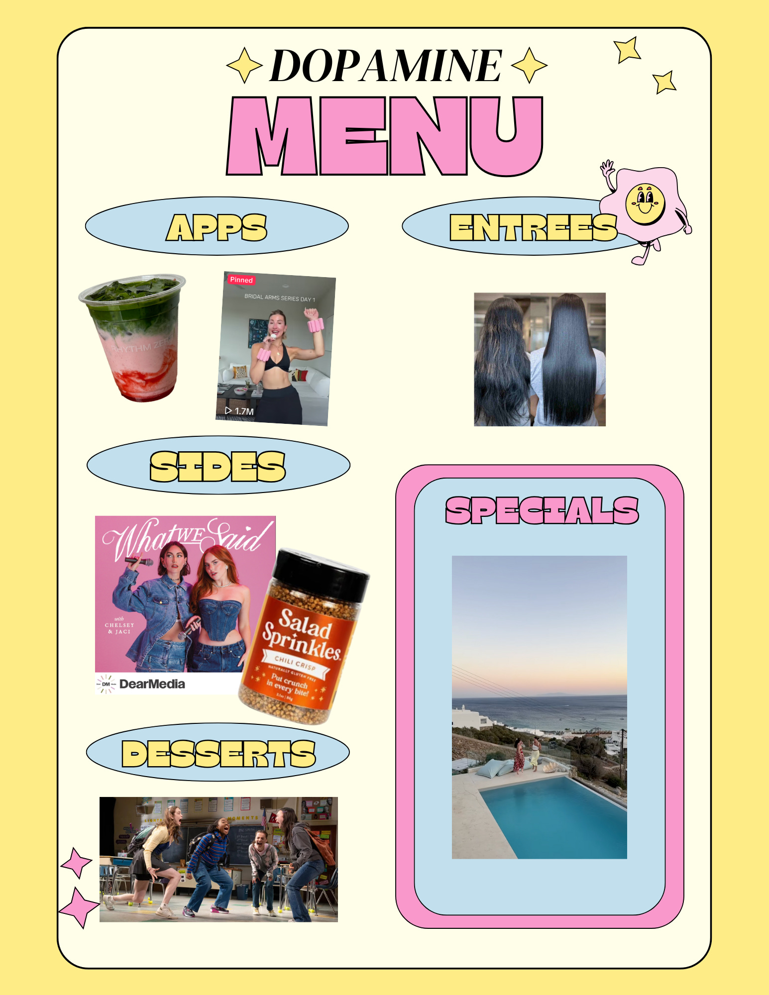 A "dopamine menu" is a personalized list of activities, items, and/or experiences that you know bring you immediate joy – ideally, these are phone-free to help replace the act of reaching for your phone when you need a little pick me up :) guilty as charged :)